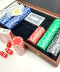 Exclusive Poker Set | PXL 20.300 The set consists of 300 chips weighing 11.5g in 5 colors, 2 decks of high-quality cards, 5 dice - 16mm side and a dealer button to facilitate the game, A high-quality box in a dark brown color with a velor molding inside. A beautiful, exclusive gift for a poker lover! It will definitely be perfect for a bachelor party! Dimensions:Box Dimensions: 39 x 22 cm