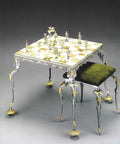 Each chess piece is finished with a genuine 24K gold layer, highlighting a medieval theme with distinctive character and weight. The board doubles as a table with sculptural legs made of onyx, bronze, and real gold accents. Included chairs are constructed from bronze and feature a soft velvet seat for comfort during extended play or display.