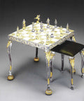 This luxury chess set is crafted from a bronze alloy using traditional techniques and plated with genuine 24K gold. Each chess piece features a refined historical motif, offering a collectible chess set that serves as both a functional game and an elegant decor accent. The ensemble includes a coordinated chess table with distinctive legs and matching chairs for a cohesive presentation.