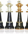 These large, decorative chess pieces offer a substantial table presence and smooth handling. The gold- and silver-plated brass provides refined contrast against the patterned wood, creating a luxury chess aesthetic that complements premium wooden chessboards. Ideal as replacement chess pieces or a standout upgrade for a display chess set.