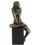 An elegant bronze-tone resin sculpture depicting a relaxed nude woman seated gracefully on a matte black geometric cube, designed as a modern accent for shelves, desks, and mantels. Hand-finished details add texture and depth, creating a refined focal point for contemporary and minimalist interiors.