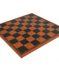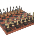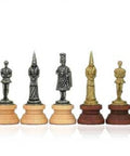 A refined chess set featuring metal and wood pieces with historical motifs and a faux leather playing board in rich brown and black. Designed for elegant home decor and enjoyable gameplay, this Italian-made set blends tradition with distinctive craftsmanship.