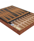 Elegant faux leather chess board with integrated storage, designed in brown and black for a refined tabletop look. This combined chess and backgammon board includes checkers and backgammon dice for versatile play at home or on the go. Hand-finished for a smooth, durable surface that is easy to maintain.