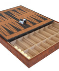 Elevate game nights with an elegant black/brown artificial leather board that serves both chess and backgammon, featuring a smooth, hand-finished surface and an integrated storage compartment for tidy organization.