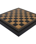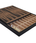 This elegant faux leather chess and backgammon board features a gold and black design with an integrated storage compartment for organizing chess pieces, checkers, and backgammon dice. Hand-finished for a refined look and smooth play, it offers a versatile setup for chess, checkers, and backgammon in a compact size suitable for home, office, or travel.