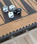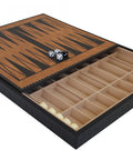 Hand-finished faux leather chess and backgammon board in elegant gold and black, designed for refined play and organized storage. The integrated compartment keeps chess pieces, checkers, and backgammon dice neatly in place between games, making this board game set practical for home or travel.