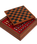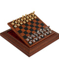 Elegant chess set featuring solid metal pieces plated with genuine gold and silver, paired with a compact wooden board. The board includes an integrated drawer for organized storage and a faux leather playing surface for a refined look and smooth gameplay.