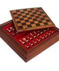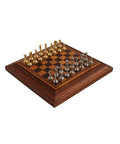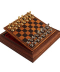 Keywords: metal chess set, gold and silver plated chess pieces, wooden chessboard, faux leather chess board, compact chess set, Italian chess set, decorative chess set, small chess board with storage.