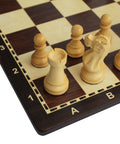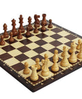 Handcrafted classic-style wooden chess set featuring acacia wood pieces and a walnut chess board with alphanumeric coordinates for easier gameplay and study. The pieces are weighted for stability and balanced handling, showcasing the natural grain and warm tones of acacia. The walnut board offers a refined contrast and clear square delineation for comfortable, standard play.