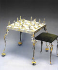 - Included: 32 gold-plated bronze chess pieces, integrated chess board/table, two bronze chairs