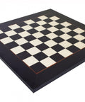 Handmade wooden chessboard with a glossy black finish, designed for precise play and an elegant look.