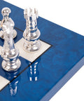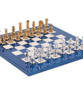 Handcrafted chess set featuring solid brass pieces plated in gold and silver, paired with a lacquered wooden board in a refined blue and white finish. Designed for elegant play and display, this classic style chess set highlights artisan detailing and Italian craftsmanship.