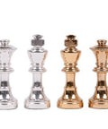 - Materials: solid brass chess pieces; gold and silver plating; lacquered dark wood board