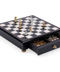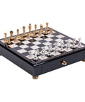 A classic, handcrafted chess set featuring solid brass pieces and a lacquered wooden board with integrated storage. Each piece is hand-finished in brass and plated in contrasting gold and silver tones for clear side distinction and refined presentation. The board is made from dark, high-quality wood, set on small feet, and includes a hinged drawer to neatly store all chessmen after play.