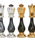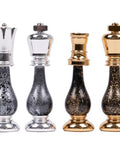 These brass chess pieces with decorated wood accents deliver a balanced weight and timeless aesthetic. The detailed hand-finishing highlights the classic design, while the gold and silver plating complements the ornate wood grain for a sophisticated set of luxury chess pieces.