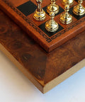 Refined chess set featuring metal pieces plated with real gold and silver, paired with a compact wooden board finished with a faux leather surface. This classic design offers durable construction and an integrated storage solution for organized play and display.