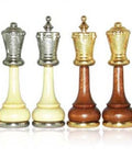 Classic-style chess pieces crafted from metal and wood, hand-finished with precise detailing and coated in gold and silver tones for a refined, timeless look.
