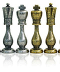 Hand-finished metal chessmen in a classic style, crafted with precision and adorned with gold and silver plating. Subtle engraved patterns add an elegant touch, making them suitable for refined play or tasteful display.