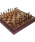 Ideal for enthusiasts seeking a classic chess set with metal chess pieces, a faux leather chess board, and the added value of a checkers and backgammon set. The integrated storage keeps every component organized and protected between games.