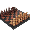 The chess pieces are made from high-quality acacia wood, known for strength, durability, and a distinctive grain. Each piece is hand-shaped and smoothed for a comfortable feel and consistent balance. The handmade chess board is crafted from premium natural leather in black and brown, offering a soft yet stable playing surface with a rich, refined look.