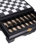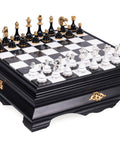 The chess pieces are hand-finished in genuine brass plated with gold and silver tones, accented with wood elements in classic black and white. The board is artisan-made from fine wood, finished with a marble top and supported by elegant feet. A built-in pull-out drawer keeps the full set organized when not in use.