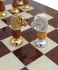- Pieces: Hand-finished brass and wood chess pieces, brass plated in gold and silver tones for contrasting sides