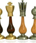 Oversized, classic-style chess pieces handcrafted from brass and wood, featuring detailed artistry and a refined presence. Brass elements are coated with gold and silver for a distinguished two-tone finish that complements the natural wood grain. Made in Italy.