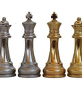 These gold and silver metal chess pieces feature detailed hand-finishing that enhances their classic design, making them suitable for display and regular play. The metallic construction provides a solid feel, while the coordinated finishes create a cohesive luxury chess set aesthetic.