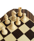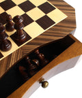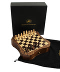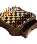 A compact magnetic wooden chess set crafted from mahogany and maple with a solid wood board and a distinctive, classic design. The board features an integrated pull-out drawer for convenient storage of the chess pieces, making it practical for home use and easy to take on the go.