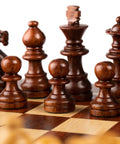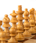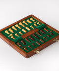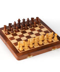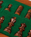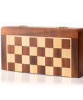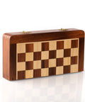 Handcrafted wooden magnetic chess set with a compact board and integrated storage, designed for practical everyday use and easy portability. The magnetic pieces stay securely in place, making this travel chess set ideal for playing at home or on the go. Includes a matching set of wooden checkers for two classic games in one.