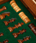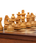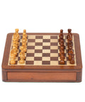 Handmade magnetic wooden chess set with a compact board and integrated storage drawer, designed for easy transport and everyday play. This classic board game set combines durability, practicality, and timeless style, making it suitable for home, office, or travel.