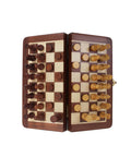 A compact, handmade wooden chess and checkers set with a folding magnetic board designed for travel and everyday play. The magnetic pieces stay in place on the board, making this portable chess set easy to use on the go and convenient for storage between games.