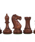 Classic-style wooden chess pieces handcrafted from high-quality mahogany, featuring a rich, reddish-brown finish. Each piece is weighted for stability and fitted with a leather-bottom base to protect your chessboard and ensure smooth, quiet moves.