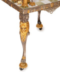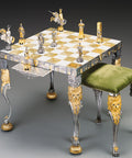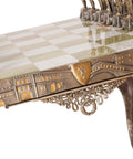 The matching chessboard table showcases distinctive legs crafted from onyx, bronze, and real gold accents. Two coordinating chairs are included, constructed from bronze with a soft velvet-upholstered seat for comfort. This onyx chess table and chairs ensemble serves as both a functional game set and a statement home decor piece for discerning chess lovers and collectors.
