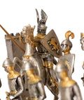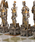 A handcrafted luxury chess set featuring bronze alloy pieces plated with genuine 24K gold, designed with a medieval aesthetic. Each finely detailed piece reflects historical motifs, creating a collectible chess set for display and play.