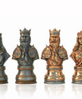Handcrafted medieval-themed chessmen made from solid pewter, detailed by hand and plated in gold and silver for a refined, historical look. The durable metal construction highlights intricate artistry while providing lasting quality for display or play.