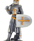 Hand-painted pewter figurine depicting a medieval crusader knight with an axe and shield, crafted with authentic historical armor details. Each piece is individually decorated, giving it a distinctive character suitable for collectors and medieval decor enthusiasts.