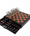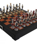 Renaissance Chess Set with Metal Pieces & Leather Board, Handmade Italy, Drawer