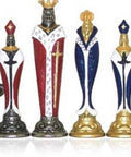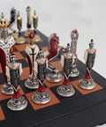 Renaissance-inspired handmade chess set featuring hand-finished, hand-painted metal chess pieces and a genuine leather chess board with integrated storage.