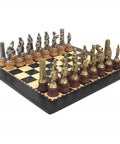 Handcrafted chess set featuring Romans vs Barbarians, with metal and wood pieces and a wooden, ebony-style chessboard. Each chess piece is hand-finished and portrays historical motifs, creating an authentic and distinctive look for display and play. The wooden board presents a refined, dark-toned aesthetic that complements the thematic metal/wood chessmen.