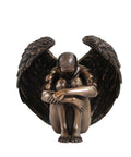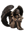 A contemplative winged man statue that captures a quiet moment of reflection, this bronze-tone resin sculpture brings symbolic depth to modern home decor and office desk decor. The seated figure with folded wings and a relaxed pose evokes inner strength, ambition, and serenity, making it a meaningful art sculpture for display on a shelf, mantel, or workspace.