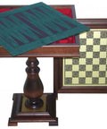 Elegantly crafted wooden game table featuring a brass‑style tabletop chessboard, integrated backgammon surface, and a built‑in compartment for organizing chess pieces. A refined addition to any living space or game room, combining functional storage with classic board game enjoyment.